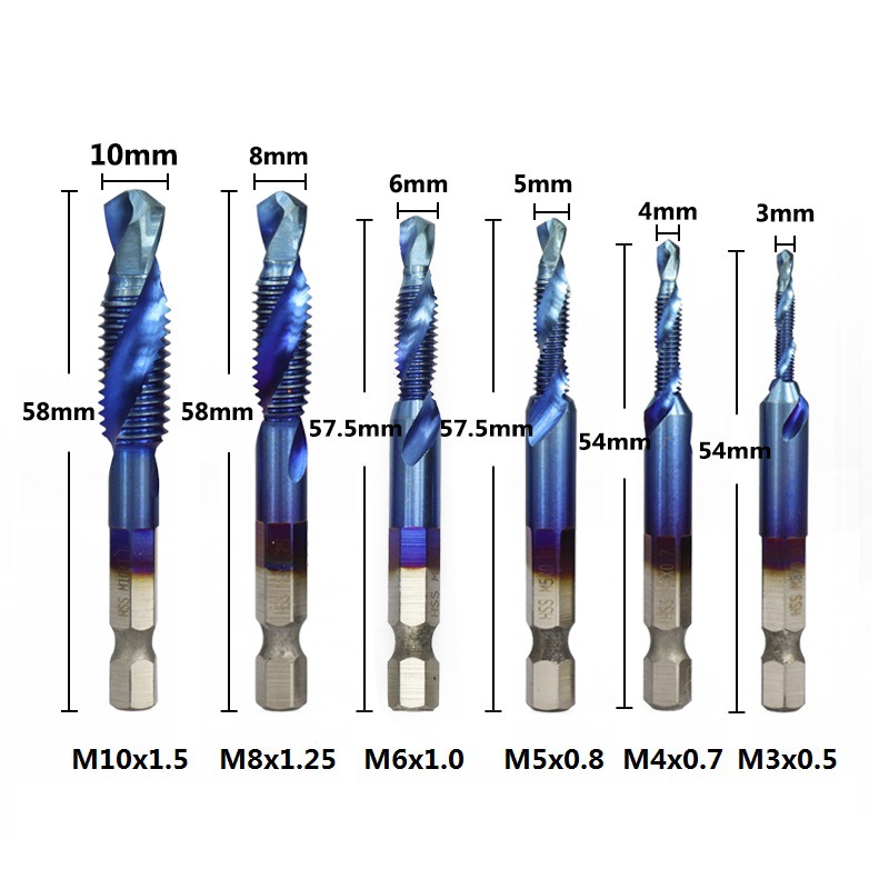 Material: High speed steel Thread type: 55° conical pipe thread Series: compound taps. Models: M3, M4, M5, M6, M8, M10