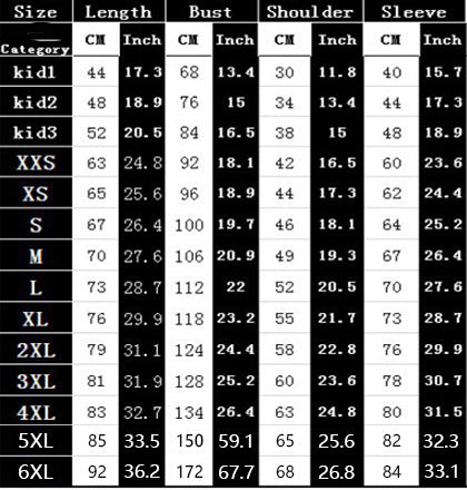 Size: XXS, XS, S, M, L, XL, XXL, XXXL, XXXXL, XXXXL, 5XL, 6XL